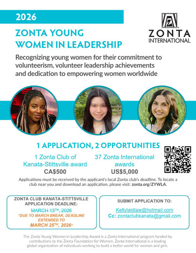 Application for the Zonta Club of Kanata-Stittsville’s 2026 Zonta Young Women in Leadership Award is now open!